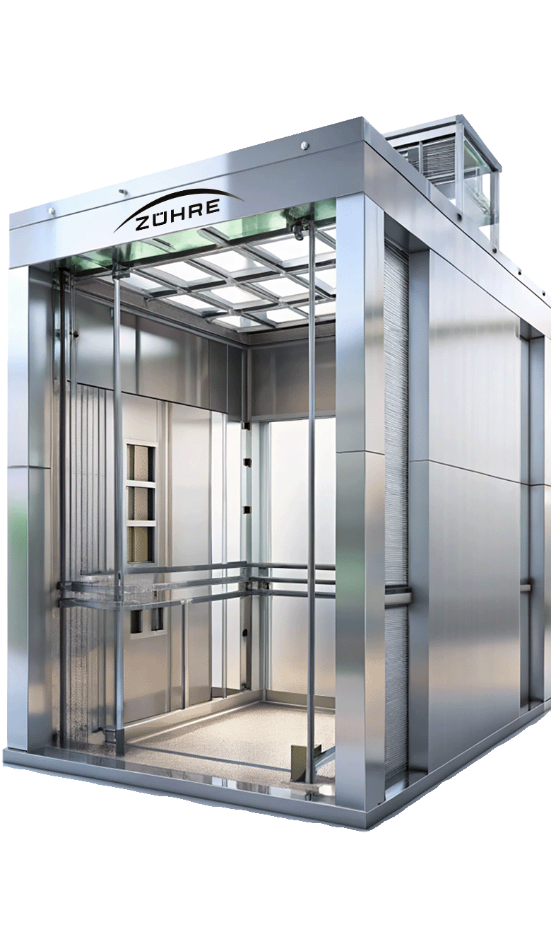 Alışveriş merkezleri ve otellerde kullanılan, cam kabinli şeffaf asansörlerdir. Estetik bir görünüm sağlar.